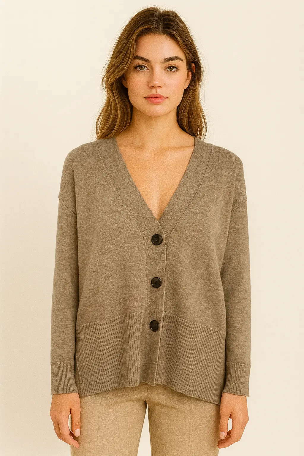 Cardigan donna in lana e cashmere, con apertura posteriore. Vestibilità morbida e femminile, ideale per look raffinati e moderni.