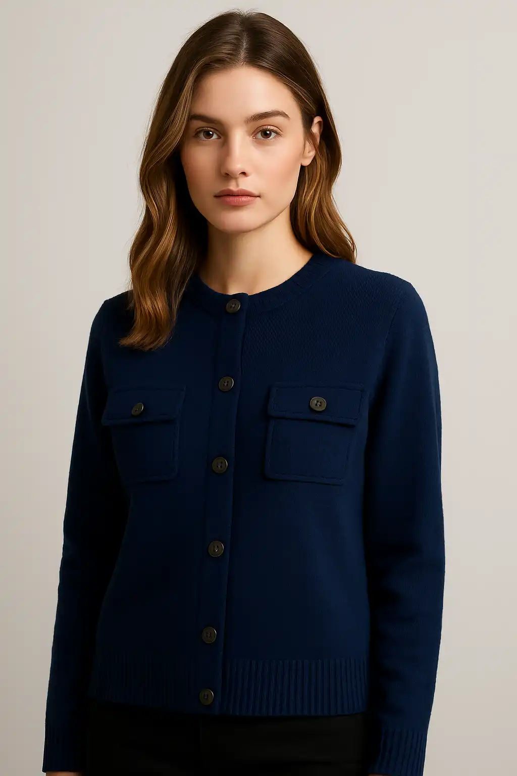Cardigan con collo coreana e piccoli taschini frontali, realizzato in pregiata lana merino. Elegante, pratico e raffinato.