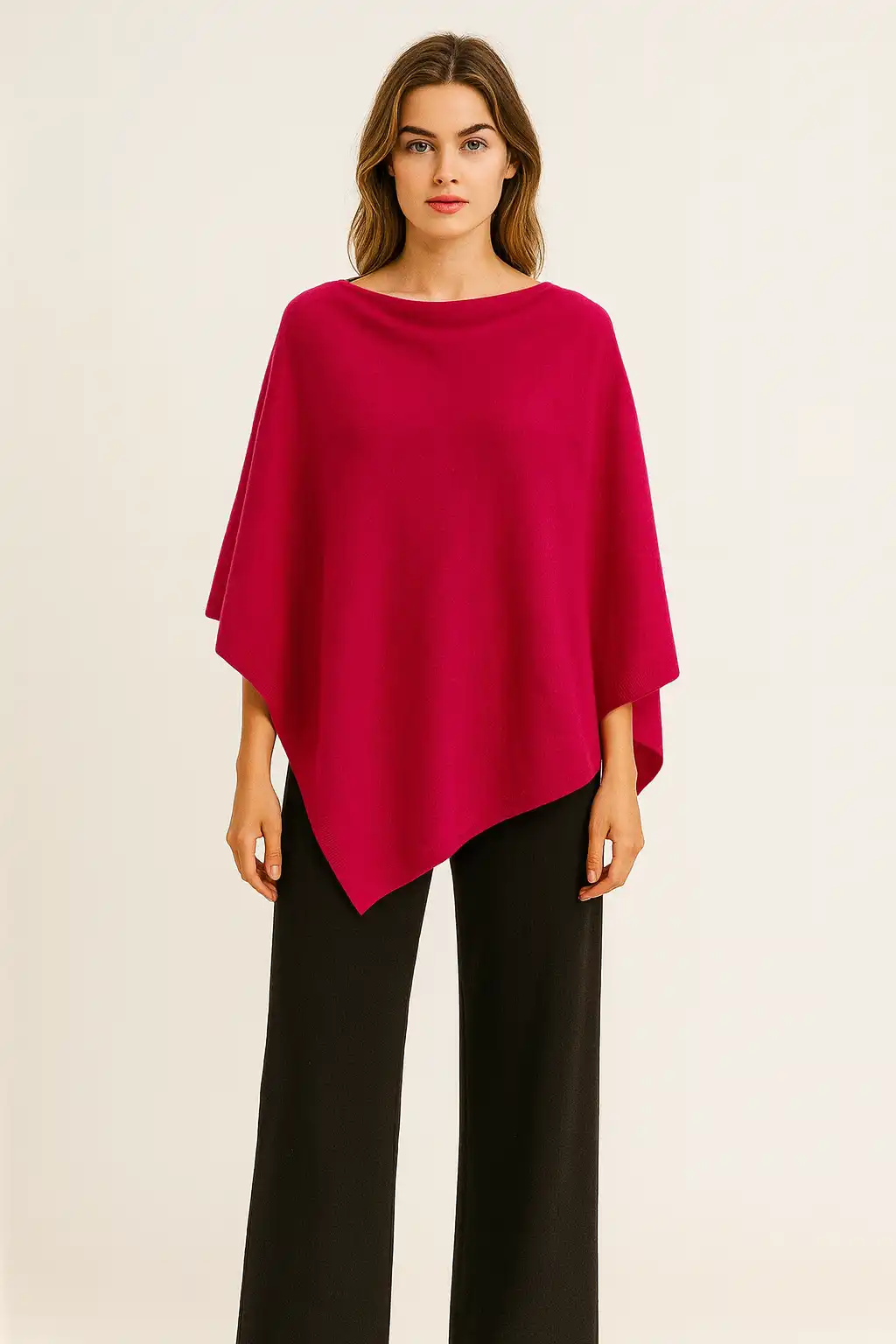 Poncho crafted from 100% cashmere, a noble and precious fiber that combines softness, warmth, and lightness. Its wide and flowing cut, sleeveless design, and delicate side neckline provide freedom of movement and enveloping comfort while adding a touch of femininity and modernity. Perfect as a light layer over dresses, shirts, or sweaters, this versatile and sophisticated piece is suitable for both casual-chic outfits and elegant occasions. A timeless wardrobe essential that enhances every look with refinement.